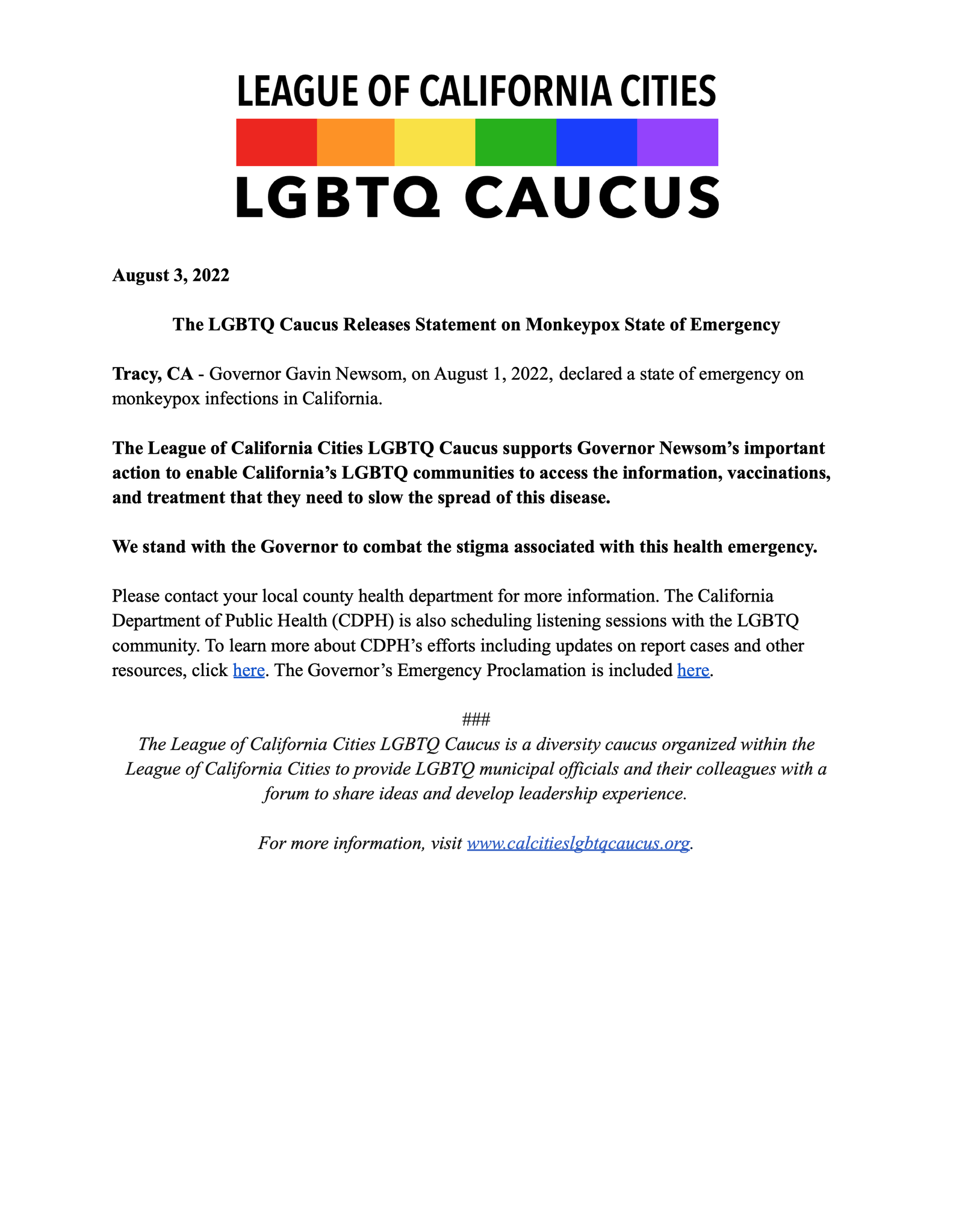 The League of California Cities LGBTQ Caucus supports Governor Newsom’s important action to enable California’s LGBTQ communities to access the information, vaccinations, and treatment that they need to slow the spread of this disease.